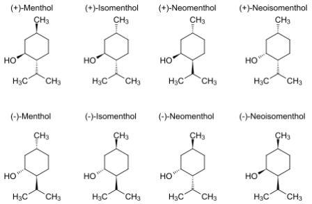 Natural menthol exists as one pure stereoisomer, nearly always the (1R,2S,5R) form (bottom left corner of the diagram below). The eight possible stereoisomers are: